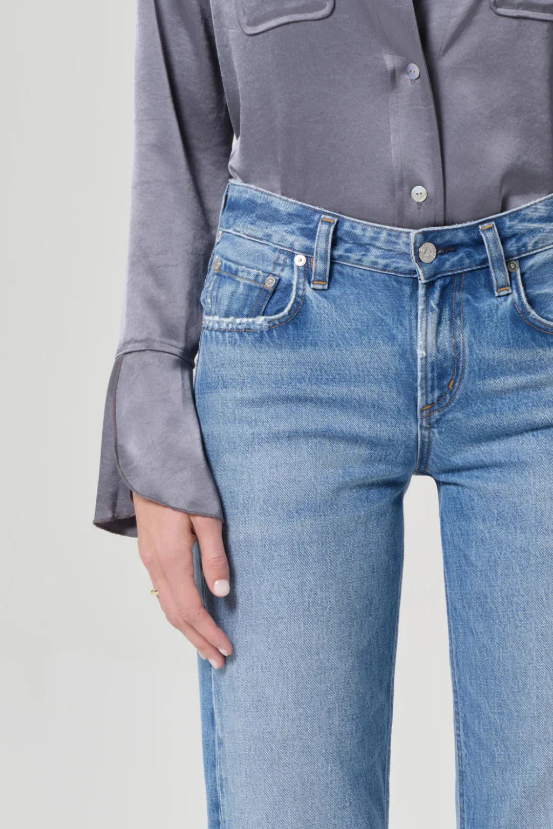 A modern nod to boyish vintage denim, the Faye sits low on the hip with a contoured inseam that enhances its slouchy, reimagined fit. Crafted from regenerative cotton in a medium indigo wash, this cropped silhouette is made from rigid, non-stretch denim with a soft hand for all-day comfort and authentic vintage character.