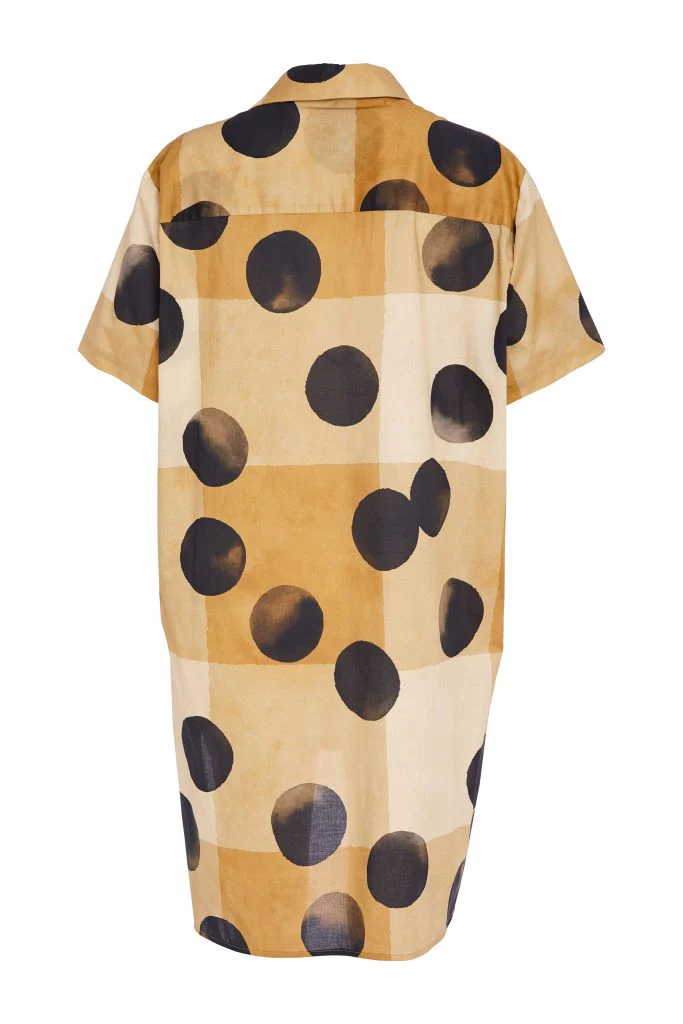 NAYA never shy’s away from a dramatic print, keeping fussy florals out they have layered a soft moon print over blocks of graded colour. All this detail is layered on to a long line tunic top with short sleeves and a shirt collar. A design that is fun and striking for you to wear.
